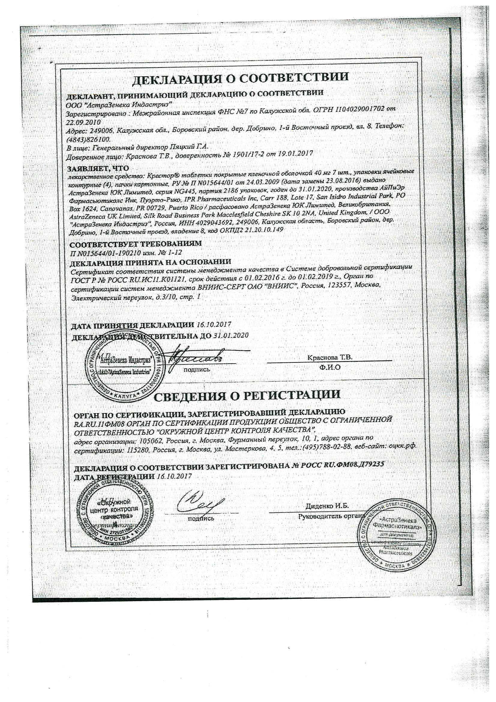 Показания. Крестор назначают для лечения первичной гиперхолестеринемии, гомозиготной наследственной гиперхолестеринемии. Оправдано купить Крестор с целью профилактики сердечно-сосудистых осложнений и для снижения скорости прогрессии атеросклеротических изменений.