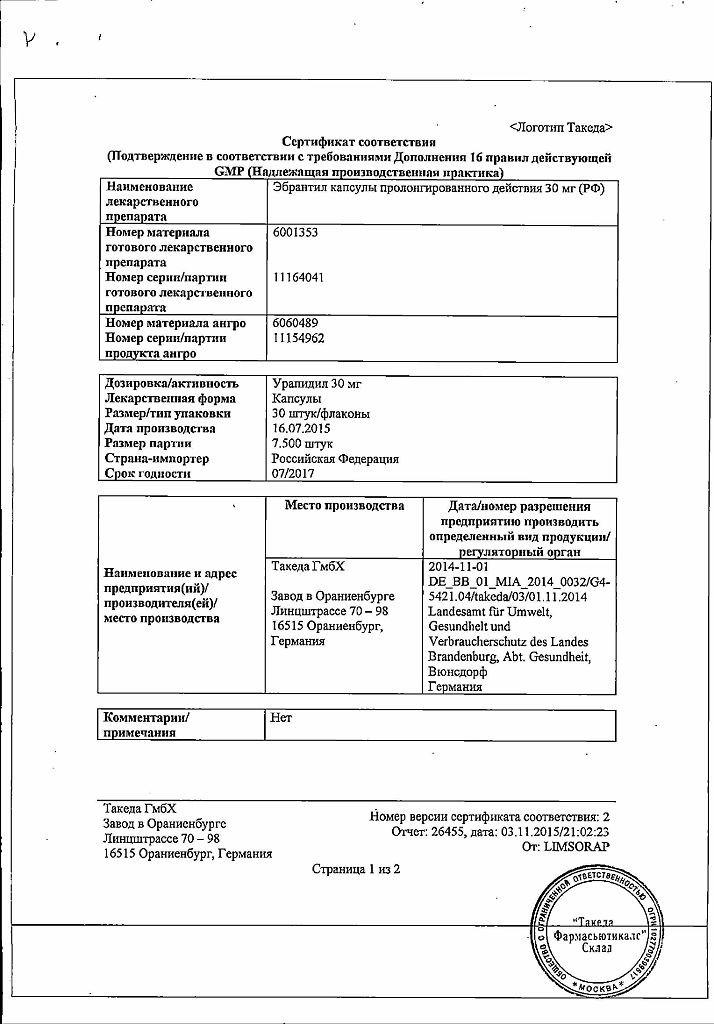 1 капсула препарата Эбрантил 30 содержит: Урапидила – 30мг;